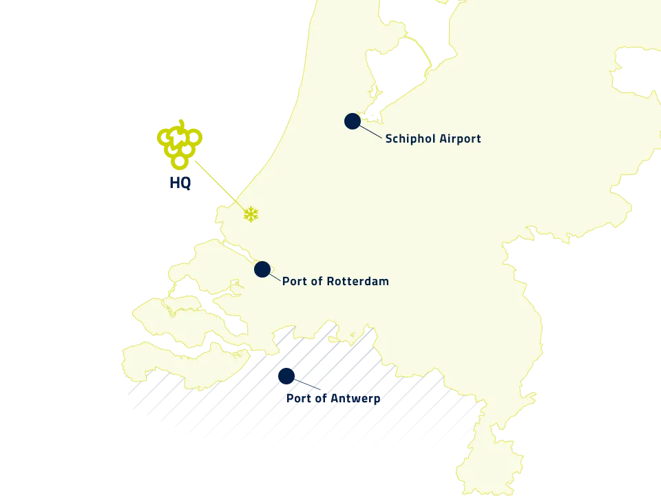 Van den Bos Freshpartners bevindt zich in Westland, een logistieke hotspot voor zowel klanten als leveranciers. Inkomende goederen stromen via logistieke knooppunten als de Rotterdamse en Antwerpse haven of Schiphol, terwijl de distributie naar klanten vaak in de buurt van diezelfde knooppunten plaatsvindt.